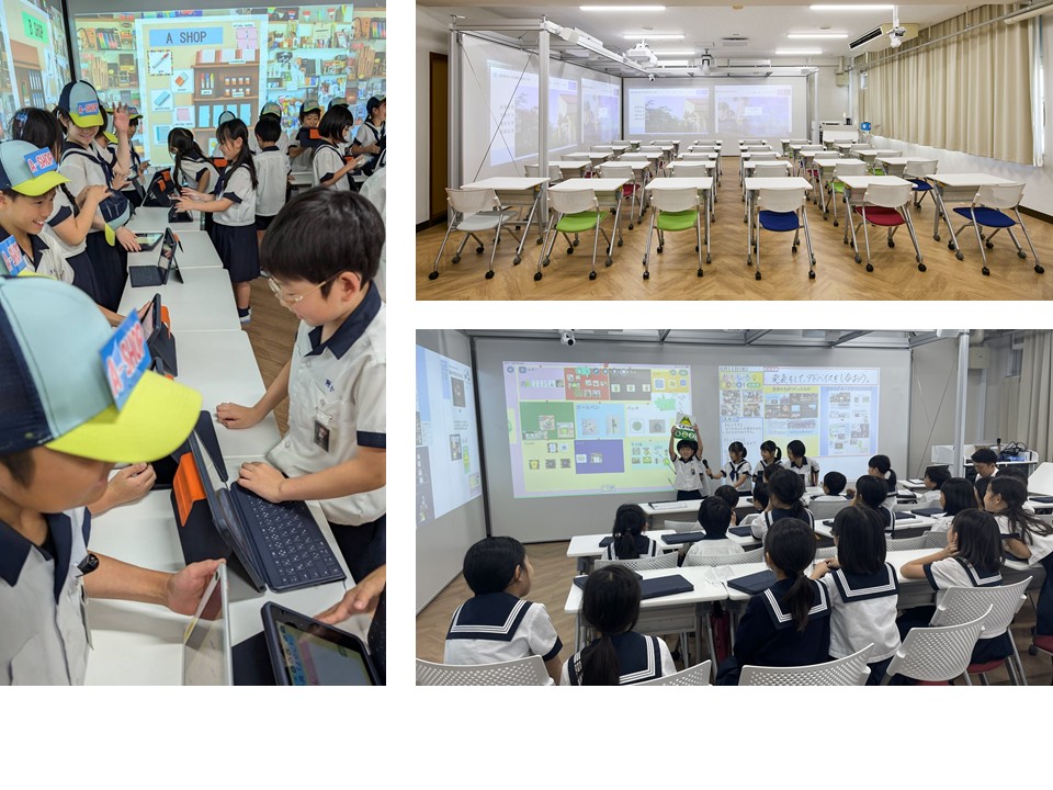本校では現在、外国語科「Do you have a pen?」の学習において、お気に入りの文房具セットを作りに向けて買い物をする際に、実際のやり取りを臨場感のある環境で行うことができるように、大画面に本物の文房具店の背景を映し出して活用しています。また、総合的な学習の時間「おもしろ久留米!大発見」の学習において、久留米の魅力を紹介する際に、見る人が引き込まれるような発表をすることができるように、大画面を用いたプレゼンテーションを行って活用しています。