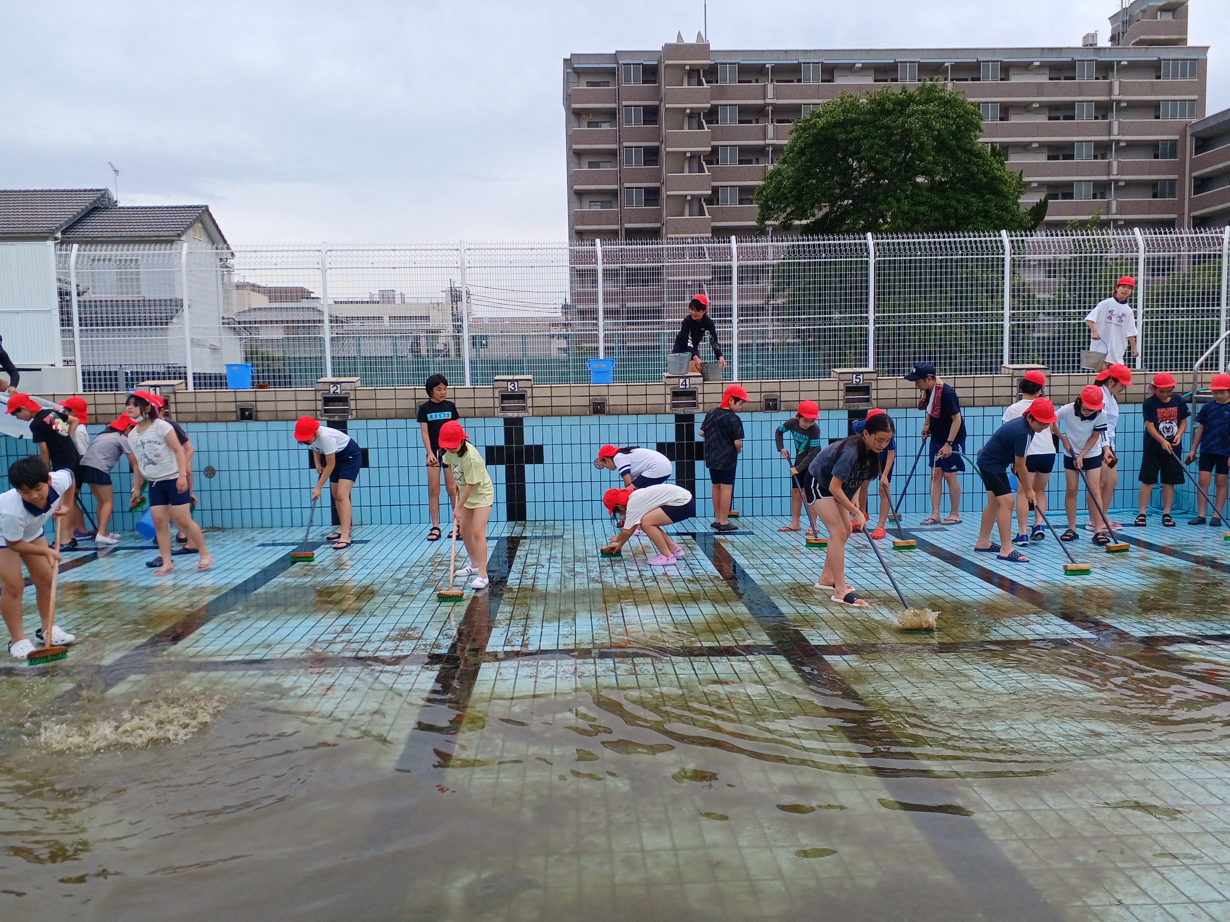 水の抜け具合の関係で、6年生のみ30日(木)の5時間目に大プールの仕上げを行いました。用務員の冨安さん、松田さんのお手伝いと高学年の児童の奮闘により、今年もきれいなプールで気持ちのよいプール開きができそうです。