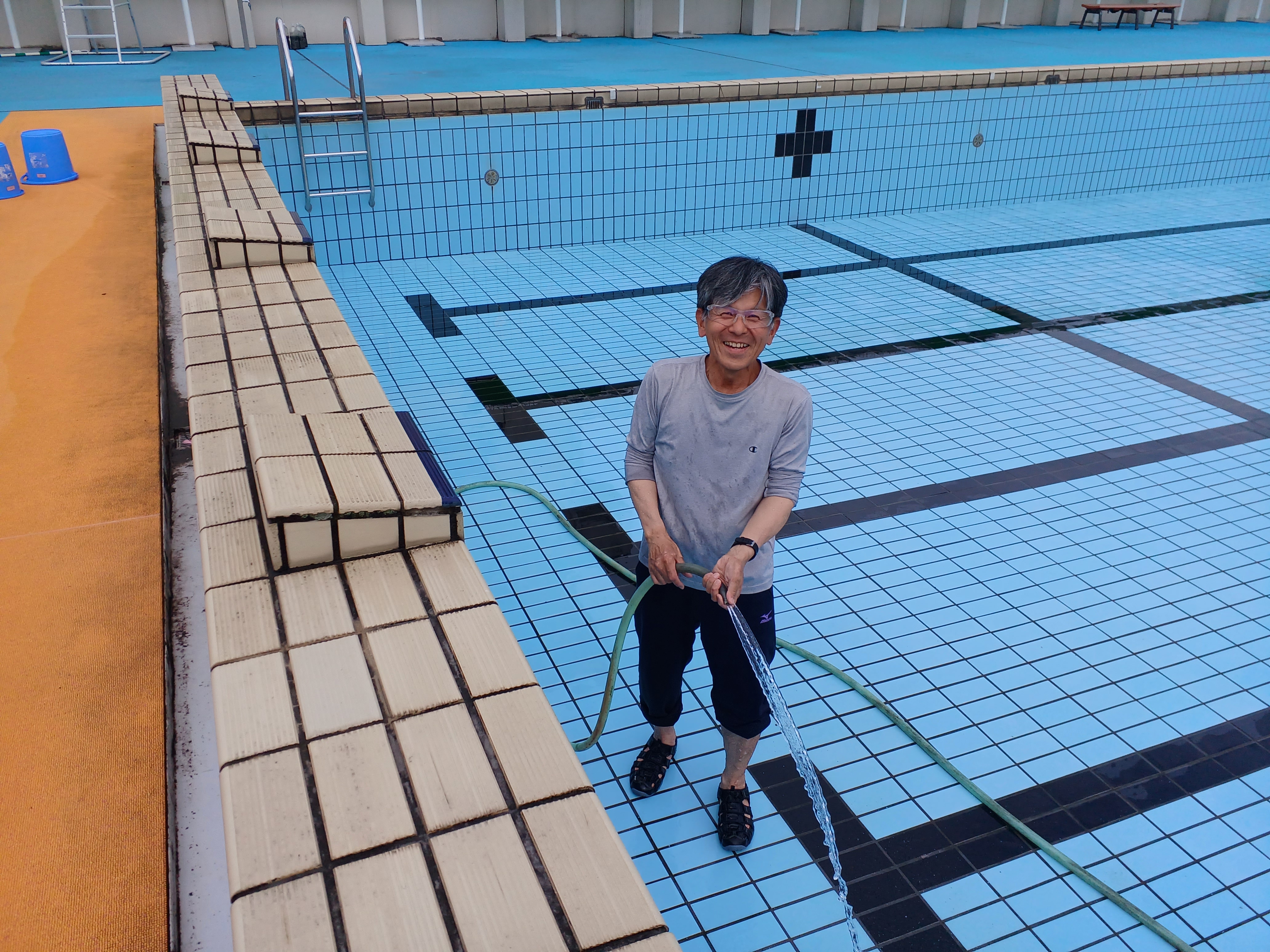 5月28日(火)の午後、5・6年生がプールの清掃を行いました。当日午前中までの大雨の影響で、想定以上に水かさが増していましたが、少しずつ水を抜きながら、デッキブラシやたわしで一生懸命に壁や床を磨く姿がありました。また、更衣室やプールサイド担当の児童は、枯れ葉やクモの巣と闘いながら、きれいにする姿がありました。